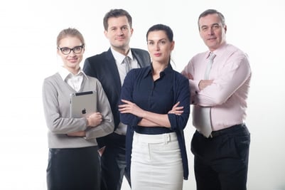 男性:上下揃いのビジネススーツ、ネクタイ着用。