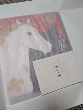 デザインは、白と黒の二頭の馬がたてがみをなびかせて走っています。後ろには赤は太陽をイメージ。そして周りのデザインは様々な新芽。大地が肥えて潤い草木が生い茂っていることを表現されているそうです。また物を包んだ時にデザインの出方も計算されているとのこと。