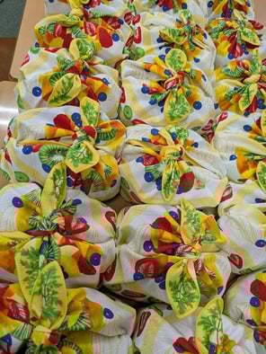 風呂敷に願いを込めて受験応援グッズを今年も包みました。受験校とご縁がありますよう「真結び」は、いつもよりきつく結びました。